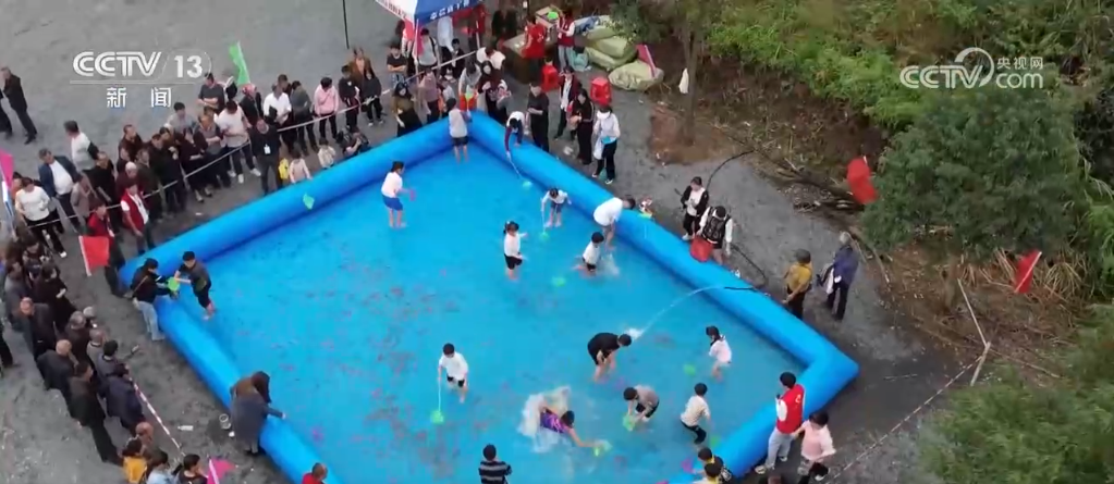 在捕魚現(xiàn)場,當?shù)剡€設立了捕魚體驗區(qū),大人們協(xié)力拉緊繩索收攏大網(wǎng),體驗豐收的喜悅;小朋友們也擼起袖子,挽起褲腿用網(wǎng)撈魚,沉浸式體驗捕魚的樂趣。