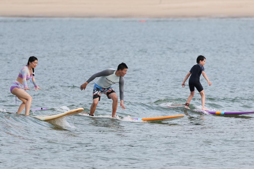 5月21日,游客在位于三亞海棠灣南端的后海村皇后灣海域沖浪。新華社記者 張麗蕓 攝