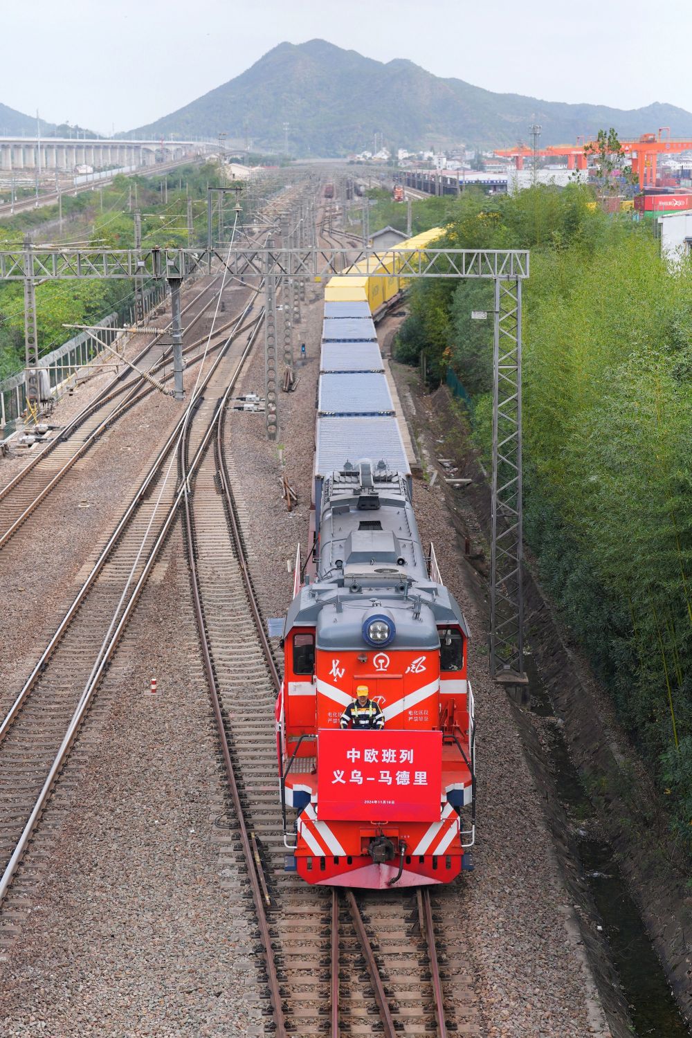18日10時許,一趟滿載110個標(biāo)準(zhǔn)箱日用百貨、汽車配件、機(jī)械設(shè)備等出口貨物的中歐班列從鐵路義烏西站駛出,駛往逾萬公里外的西班牙馬德里。當(dāng)天,義烏中歐班列迎來開行十周年。