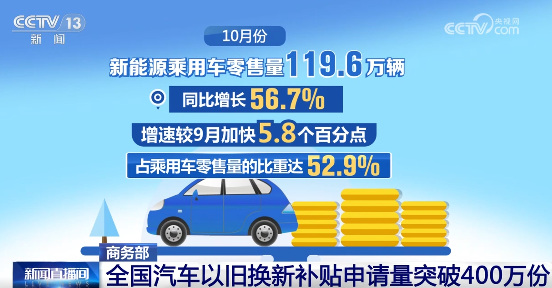 在以舊換新政策的帶動下,汽車銷量也有了明顯增長。10月份,乘用車零售量226.1萬輛,同比增長11.3%,增速較9月加快6.8個百分點。其中,新能源乘用車零售量119.6萬輛,同比增長56.7%,增速較9月加快5.8個百分點,占乘用車零售量的比重達52.9%。1—10月,乘用車零售量1783.5萬輛,同比增長3.2%。其中,新能源乘用車零售量832.7萬輛,同比增長39.8%。
