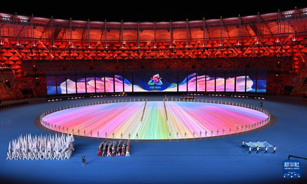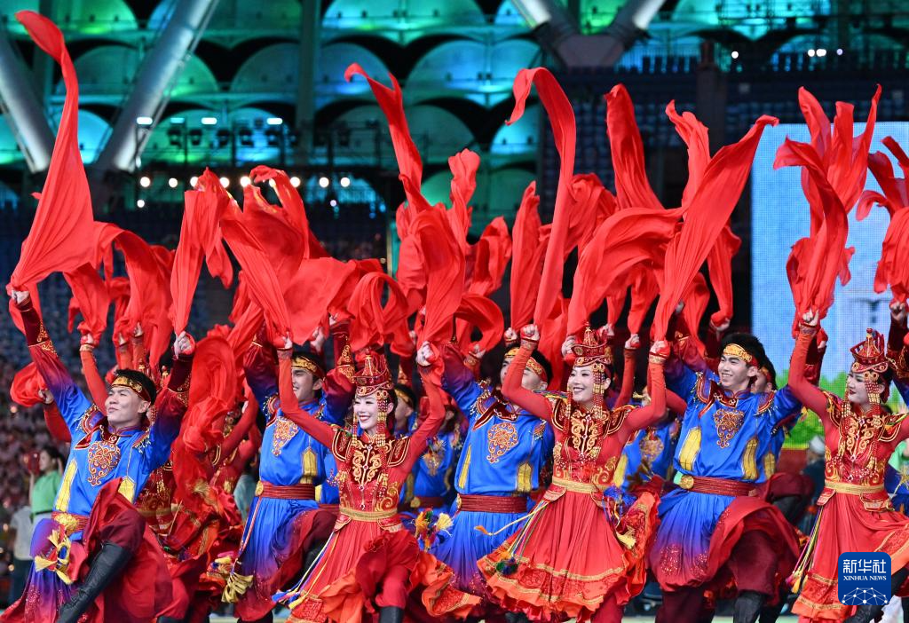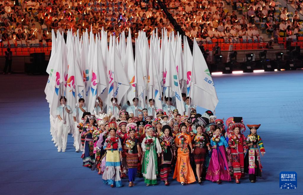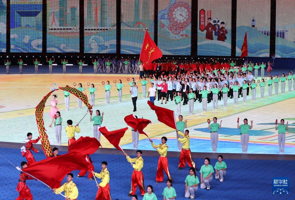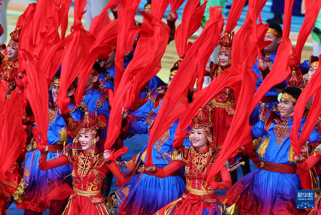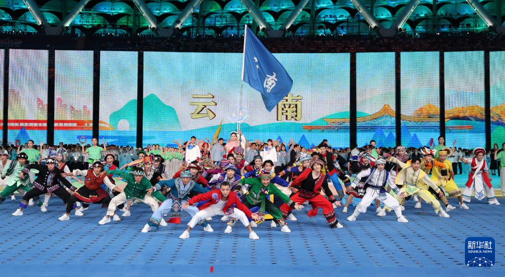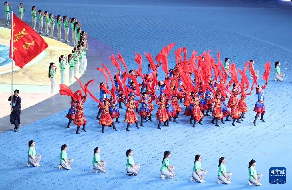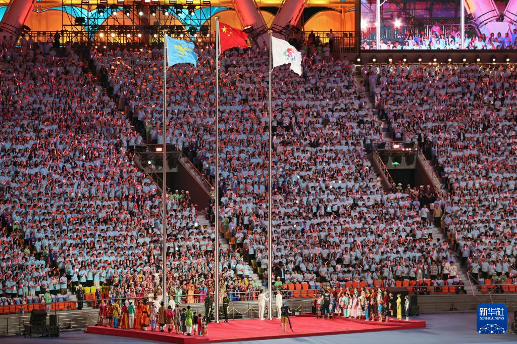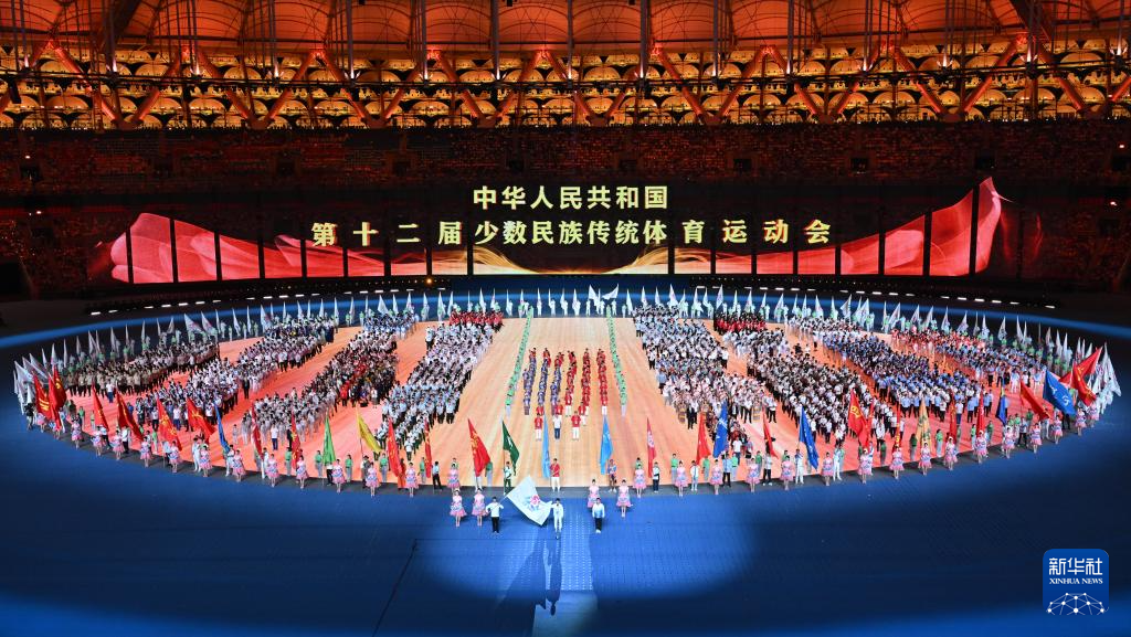 11月22日,開幕式現(xiàn)場升起中華人民共和國國旗、中華人民共和國少數(shù)民族傳統(tǒng)體育運動會會旗和中華人民共和國第十二屆少數(shù)民族傳統(tǒng)體育運動會會旗。