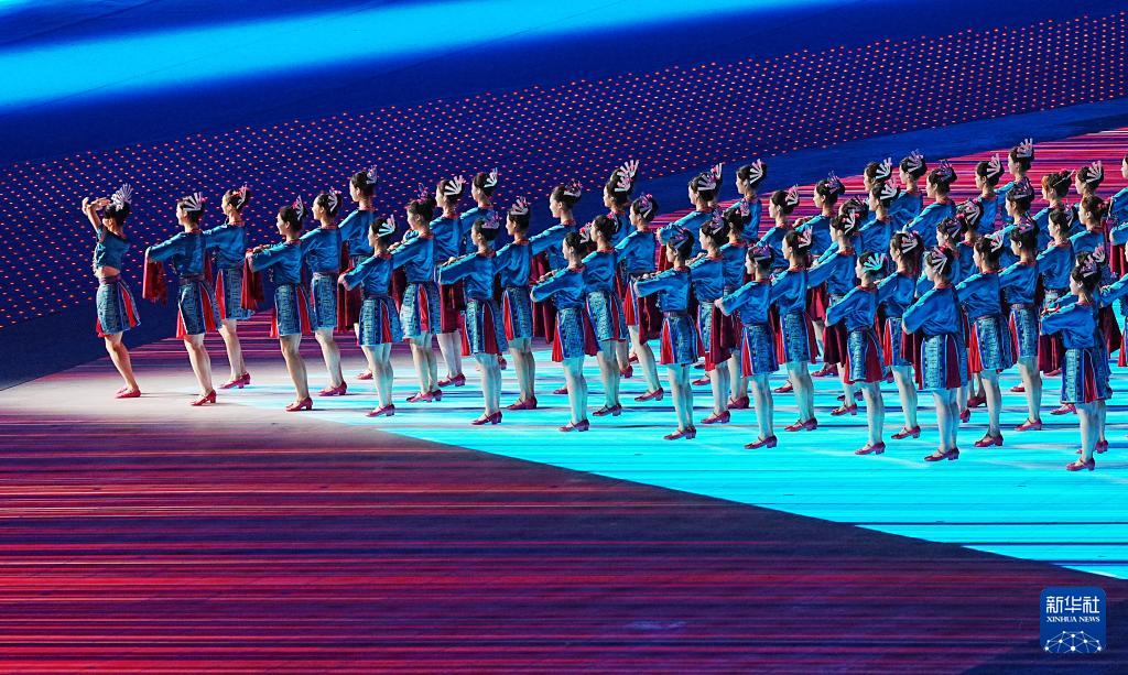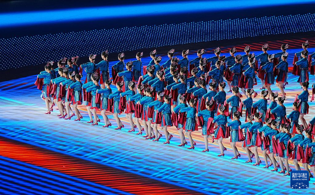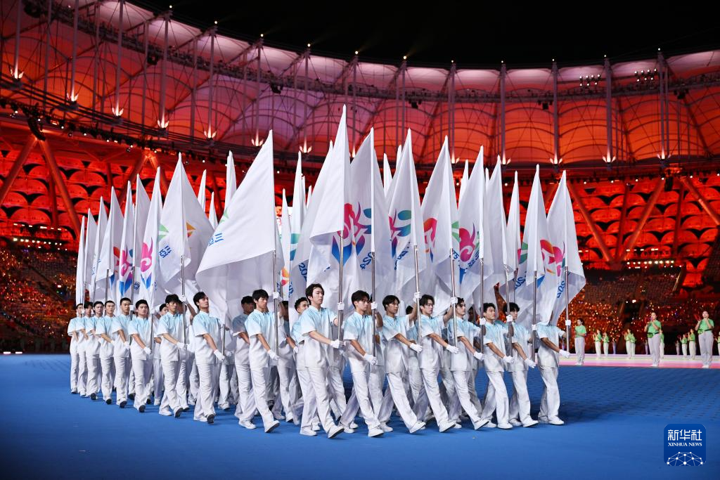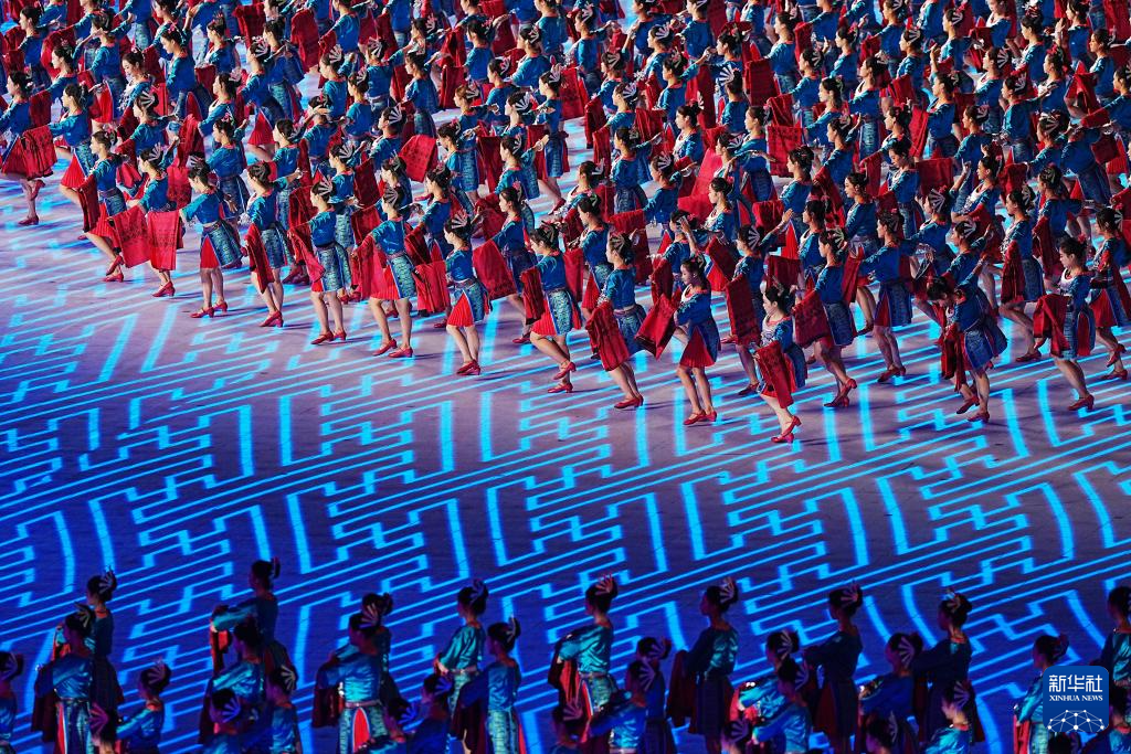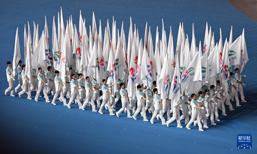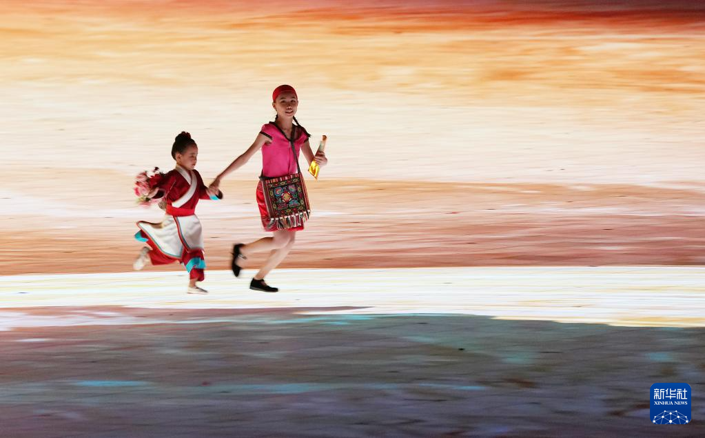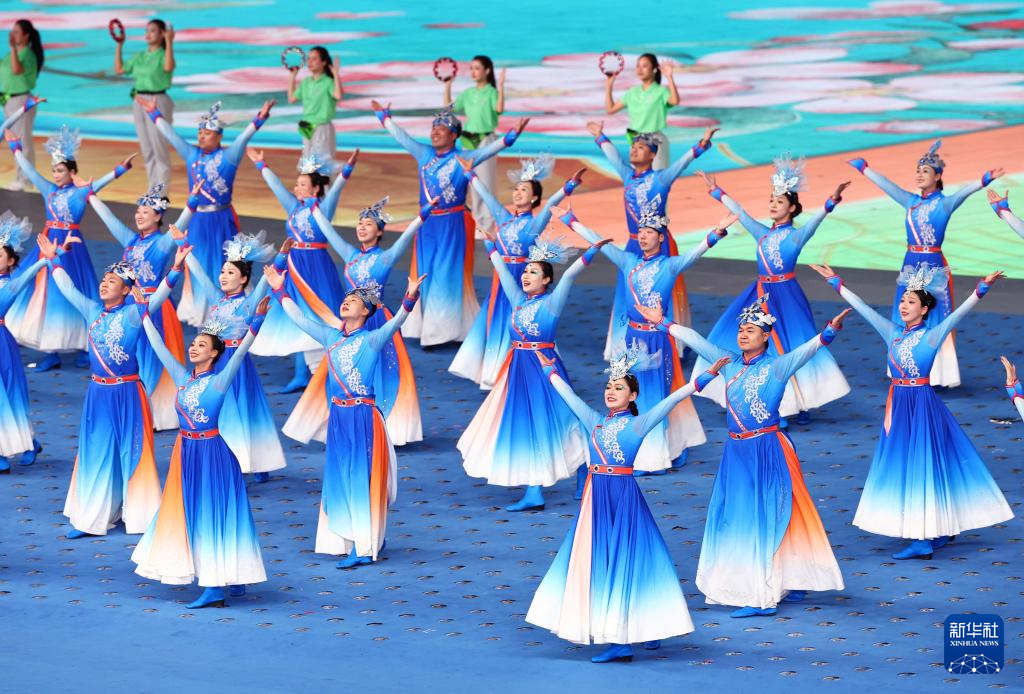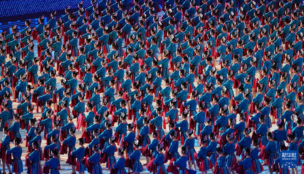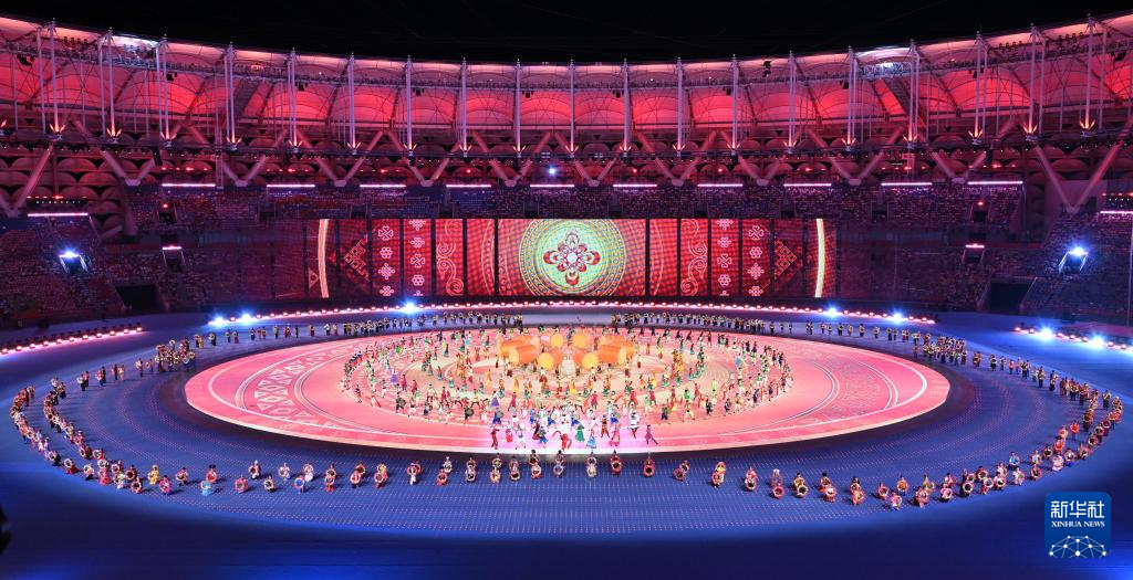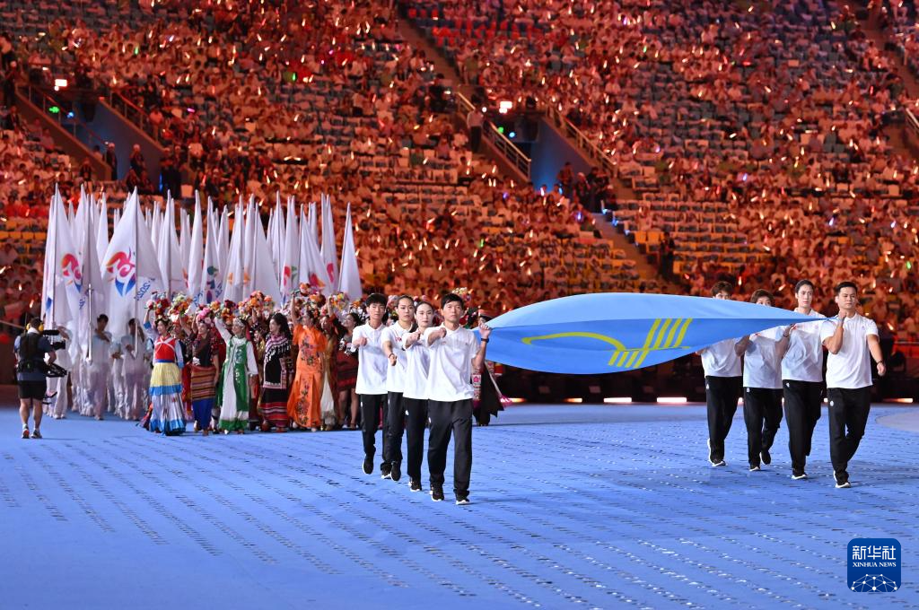 11月22日,開幕式現(xiàn)場升起中華人民共和國國旗、中華人民共和國少數(shù)民族傳統(tǒng)體育運動會會旗和中華人民共和國第十二屆少數(shù)民族傳統(tǒng)體育運動會會旗。