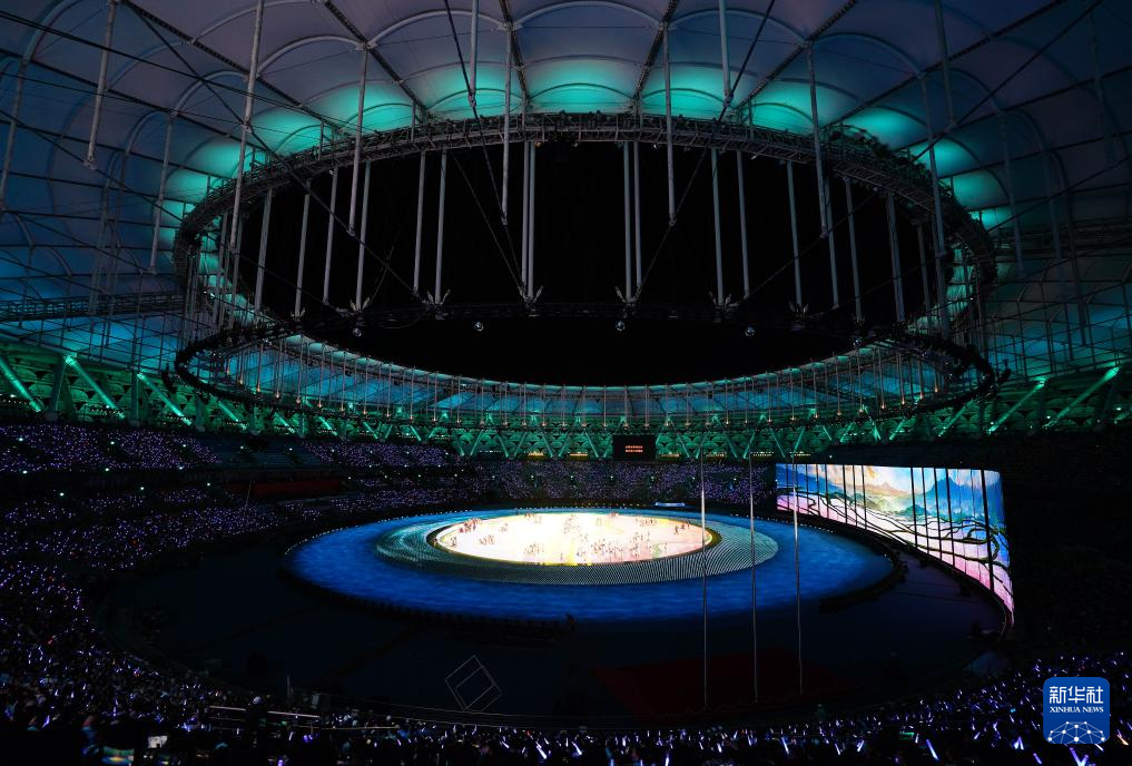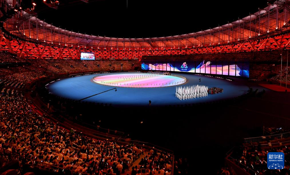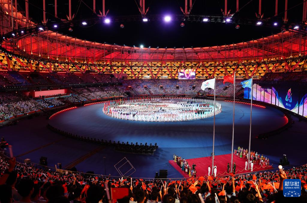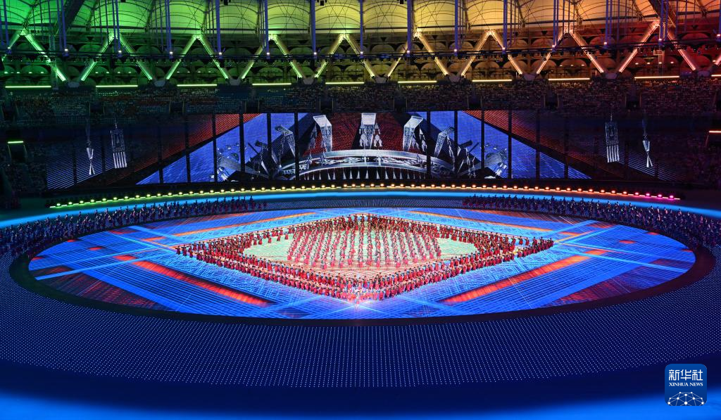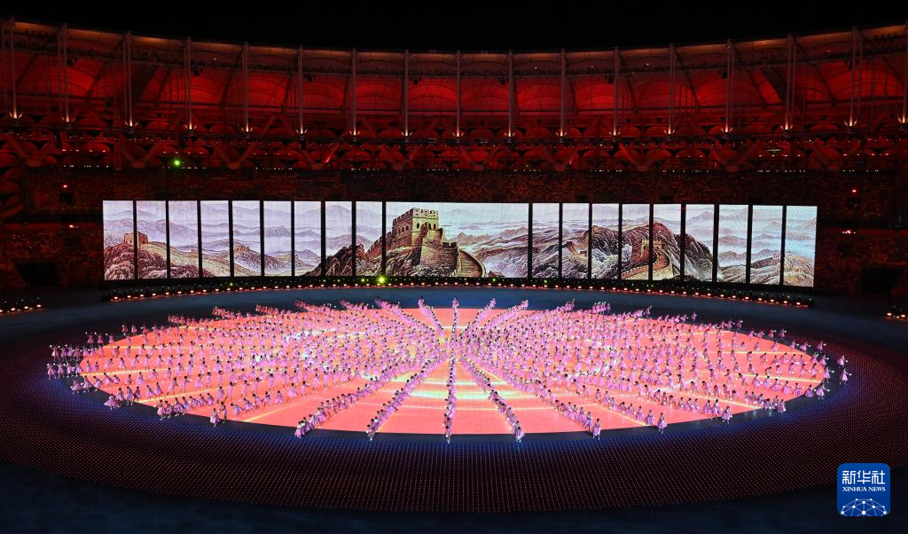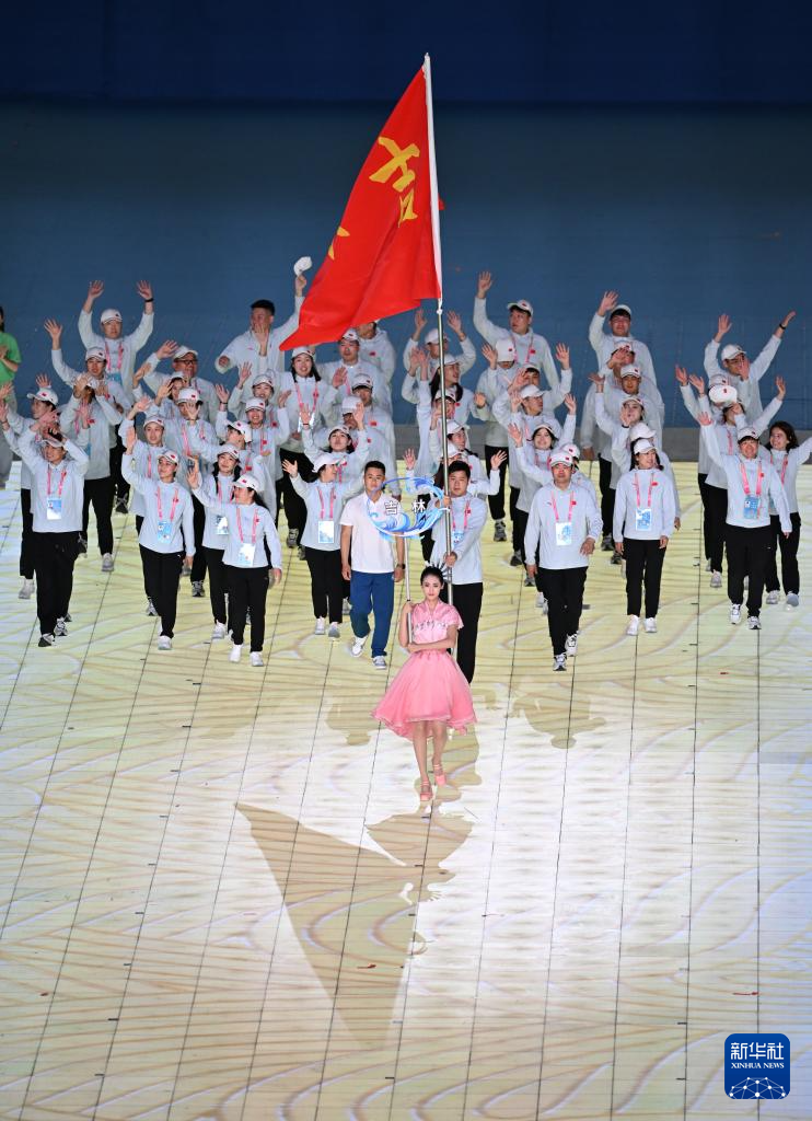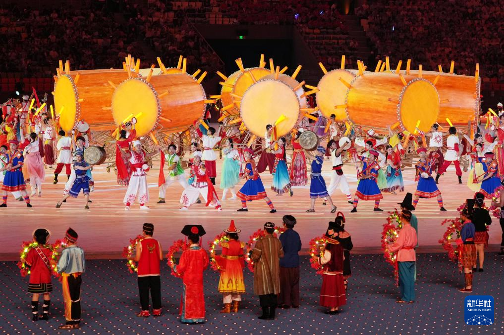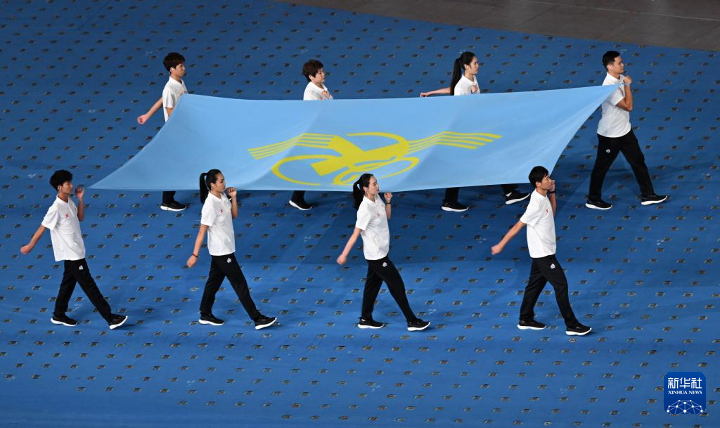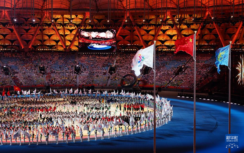 11月22日,開幕式現(xiàn)場升起中華人民共和國國旗、中華人民共和國少數(shù)民族傳統(tǒng)體育運動會會旗和中華人民共和國第十二屆少數(shù)民族傳統(tǒng)體育運動會會旗。