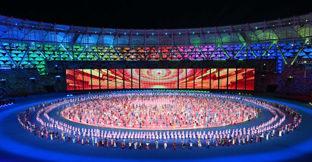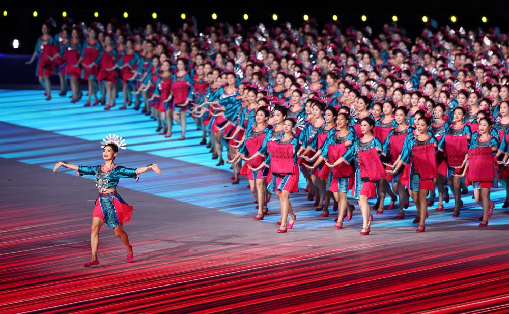 舞臺中間是一個圓形地屏,地屏外圈,導演組專門增加“星空矩形”地毯,圍繞中心地屏影像始終保持圓形圖案,構成“同心圓”;在入場儀式、節(jié)目展演、點燃火炬等多個環(huán)節(jié),身穿各民族傳統(tǒng)服飾的參賽人員、表演者等,多次在舞臺匯聚成“同心圓”;“一顆心,一個圓,一齊擁抱緊相連……”“同心圓”概念也在主題曲中彰顯。