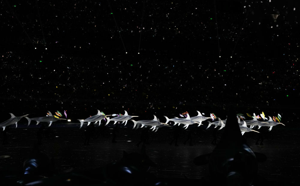 在全場觀眾“哇”的一聲驚嘆中,整座體育場化身星辰大海。騎自行車、滑輪滑、腳踩平衡車的演員們手舉海龜、鯊魚、海豚等形象魚貫而入,讓觀眾如置海底。隨后,高鐵飛馳、深海探測、火箭發(fā)射、太空行走等畫面在星海中逐一呈現(xiàn),展現(xiàn)了我國在高科技領域的發(fā)展成就,帶來生動的沉浸式體驗。