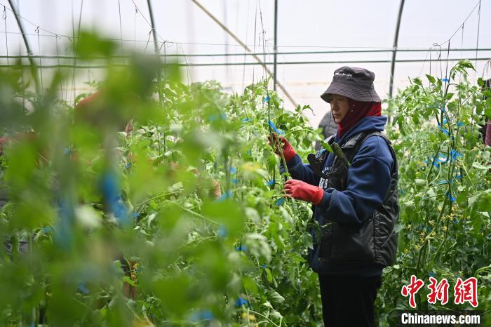 馬芬蓮和工友們忙著給番茄苗整枝打杈,她額頭上因地震房屋倒塌留下的疤痕仍清晰可見(jiàn)。與記者交流時(shí),不時(shí)有同村婦女打來(lái)視頻電話(huà)咨詢(xún)種植問(wèn)題。
