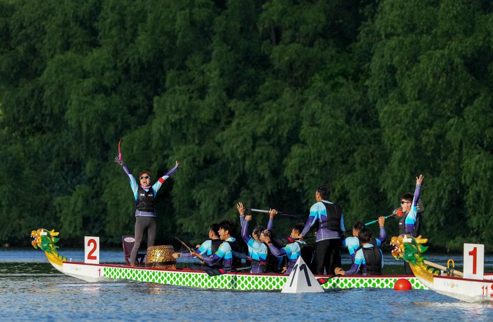 11月25日,云南隊在決賽后慶祝。最終云南隊獲得一等獎。當(dāng)日,第十二屆全國少數(shù)民族傳統(tǒng)體育運動會混合組(小龍舟)500米直道賽在海南省三亞市舉行。新華社發(fā)(杜笑微攝)