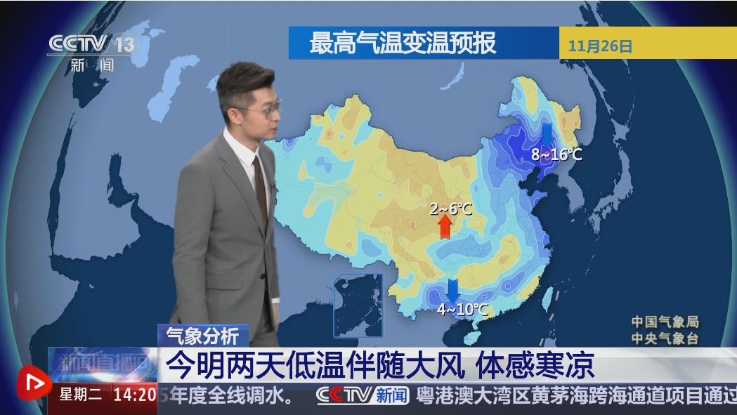 中國(guó)氣象局氣象分析師胡嘯表示,寒潮天氣過程將會(huì)在11月28日前后趨于結(jié)束,但是在結(jié)束之前仍要關(guān)注大風(fēng)降溫和強(qiáng)降雪天氣。26日早晨相比25日同一時(shí)刻,中東部大部地區(qū)氣溫已經(jīng)出現(xiàn)明顯的下降,體感寒涼。
