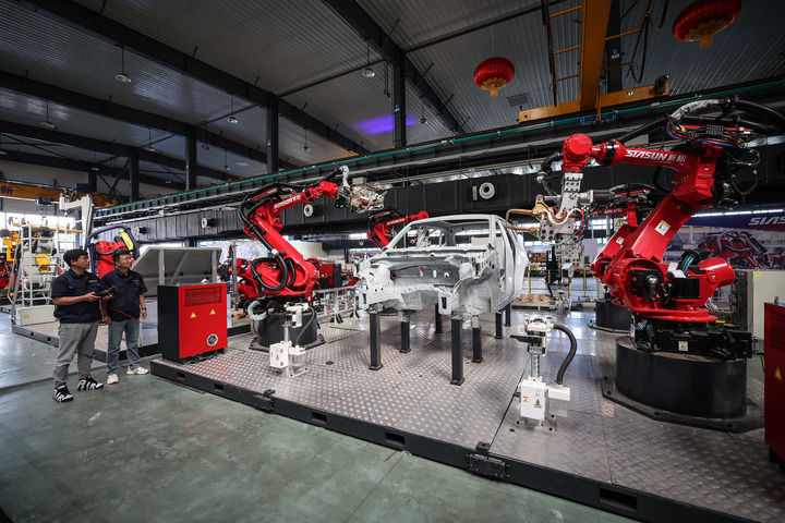 2024年6月3日,沈陽新松機(jī)器人自動化股份有限公司的機(jī)器人研發(fā)工程師在測試驗證為點焊機(jī)器人新開發(fā)的功能。新華社記者 潘昱龍 攝