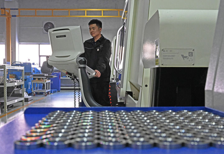 2024年3月21日,在沈陽微控飛輪技術(shù)股份有限公司,工人在機(jī)加車間操控機(jī)床。新華社記者 楊青 攝