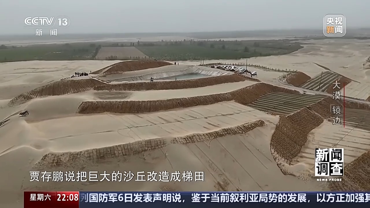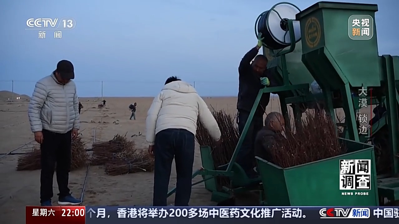 新疆于田縣林業(yè)和草原局黨組書記、副局長 賈存鵬:首先我們要到實(shí)地去勘測(cè),只要能有水的,我們?nèi)渴巧镏紊常瑳]水的地方是草方格和高立式沙障治沙。