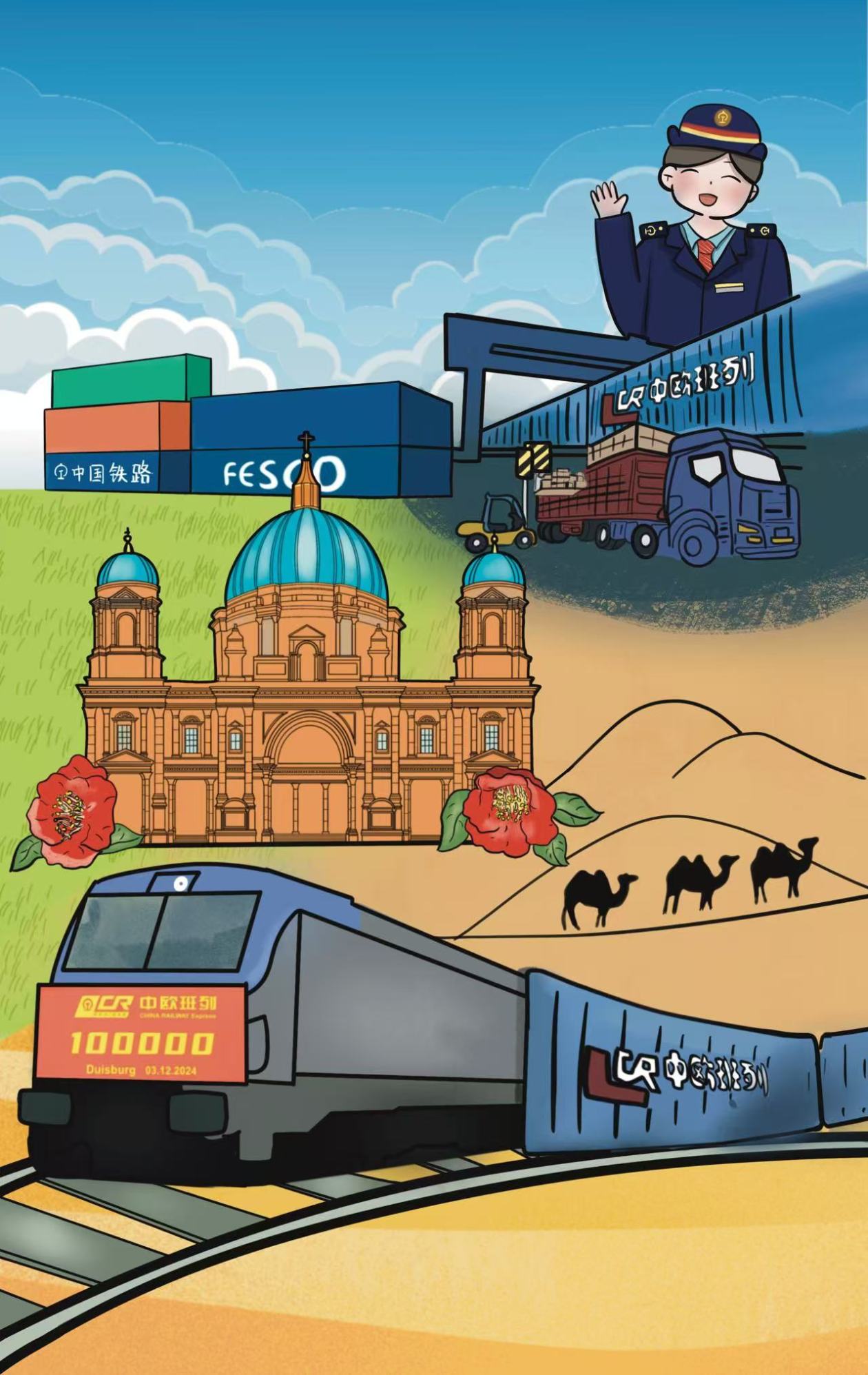 當(dāng)?shù)貢r(shí)間12月3日9時(shí)10分,從中國重慶團(tuán)結(jié)村中心站開出的第10萬列中歐班列X8083次順利抵達(dá)德國杜伊斯堡。截至目前,中歐班列已通達(dá)歐洲25個(gè)國家227個(gè)城市,連接11個(gè)亞洲國家超過100個(gè)城市,服務(wù)網(wǎng)絡(luò)基本覆蓋亞歐大陸全境。萬里鐵道蜿蜒伸展,“鋼鐵駝隊(duì)”通達(dá)八方,讓古老的絲綢之路煥發(fā)新的生機(jī)與活力。