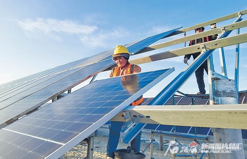 12月1日,位于和田市吉亞鄉(xiāng)的華潤新能源50萬千瓦光伏治沙項(xiàng)目施工現(xiàn)場一派熱火朝天景象。該項(xiàng)目總投資約15億元,預(yù)計明年5月底實(shí)現(xiàn)全容量投產(chǎn)。圖為工人在鋪設(shè)光伏板。 石榴云/新疆日報記者 湯永攝