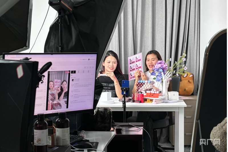 留學(xué)生正在基地直播(央廣網(wǎng)記者 楊贇 攝)