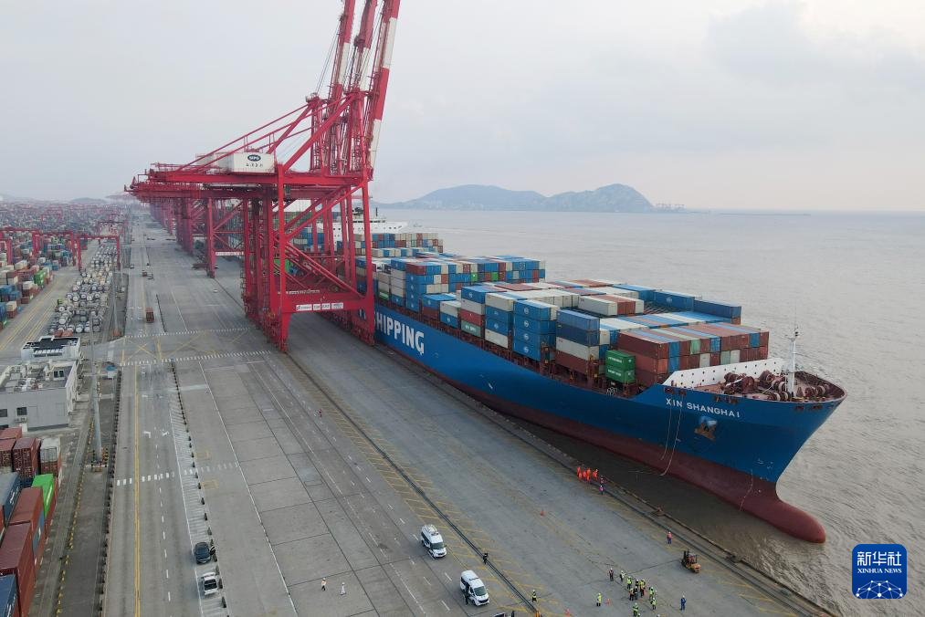 12月18日,“新上?!陛喛坎瓷虾Q笊礁鄞a頭(無人機照片)。新華社記者 方喆 攝