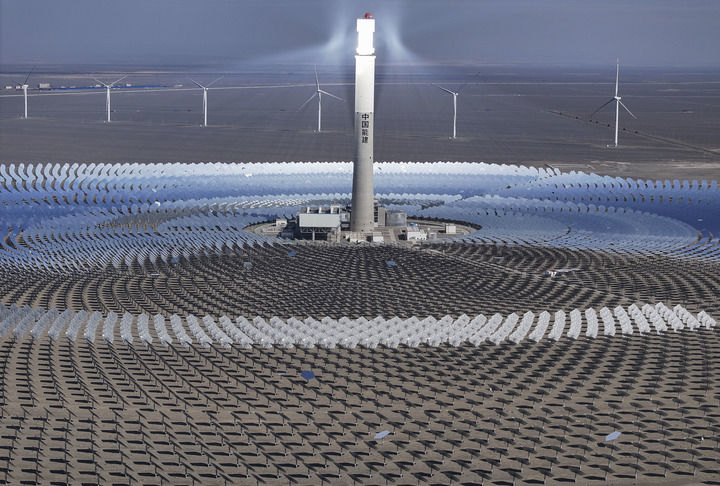這是2024年9月12日在新疆哈密市伊吾縣淖毛湖鎮(zhèn)拍攝的國(guó)家光熱示范項(xiàng)目——熔鹽塔式50兆瓦光熱發(fā)電站(無人機(jī)照片)?! ⌒氯A社記者 胡虎虎 攝
