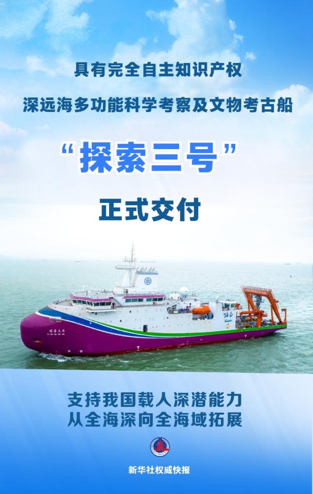 深遠海多功能科學考察及文物考古船“探索三號”26日在廣州南沙交付。此船具備完全自主知識產權,是我國首艘具備全球(含極區(qū))深遠海探測和冰區(qū)載人深潛支持能力的綜合科考船。