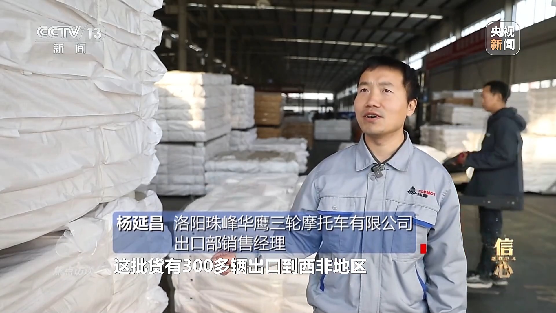 洛陽珠峰華鷹三輪摩托車有限公司出口部銷售經(jīng)理 楊延昌:“這批貨有300多輛出口到西非地區(qū),目前訂單量已經(jīng)達(dá)到了3萬臺,排到了25年3月份。”