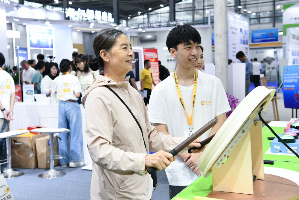 10月27日,老人在2024深圳國(guó)際智慧養(yǎng)老產(chǎn)業(yè)博覽會(huì)上體驗(yàn)樂齡鼓。(新華社記者 梁旭 攝)