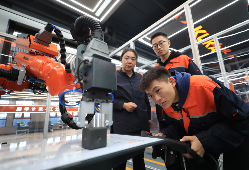 產(chǎn)教融合促就業(yè)。11月22日,沈陽工學(xué)院電氣工程及自動(dòng)化專業(yè)學(xué)生操作機(jī)器人進(jìn)行物料碼垛實(shí)訓(xùn)。(新華社記者楊青攝)