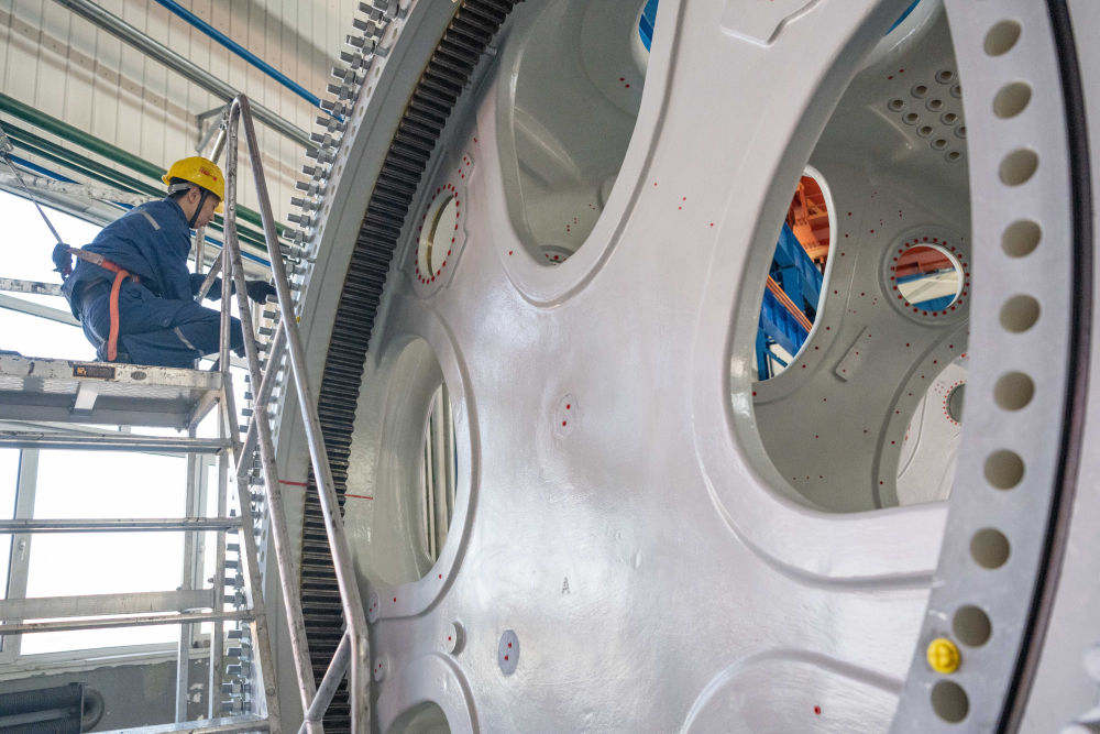 工人在位于黑龍江省齊齊哈爾市的中國(guó)一重集團(tuán)有限公司風(fēng)電設(shè)備裝配車(chē)間加工風(fēng)電輪轂(4月28日攝)。新華社記者 謝劍飛 攝