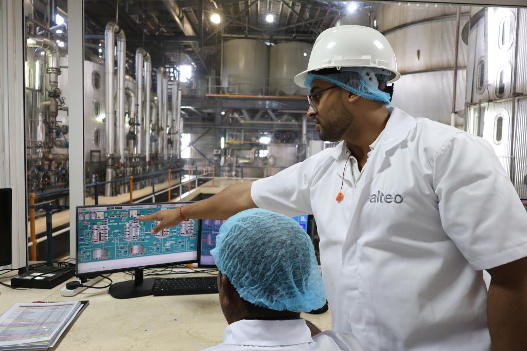 2024年7月24日,在毛里求斯東部弗拉克區(qū)一家糖廠,工人在車間內(nèi)監(jiān)測(cè)蔗糖的生產(chǎn)。新華社記者凌馨攝