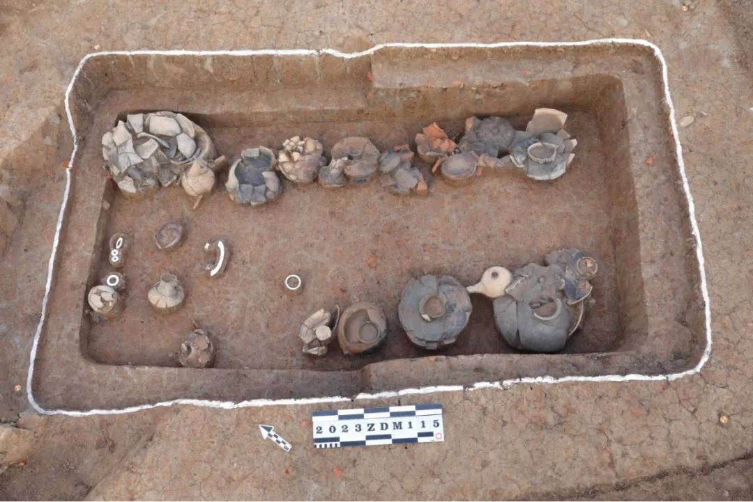 2023年以來,省文物考古研究院圍繞明晰遺址內(nèi)部布局和確認(rèn)遺址宏觀結(jié)構(gòu)兩個方面,再次開展對東山村遺址的主動性考古發(fā)掘。截至目前,共發(fā)掘新石器時代大型紅燒土堆積4處、墓葬17座、房址1座、灰坑20座、灰溝1條、水井1口、柱洞3個。