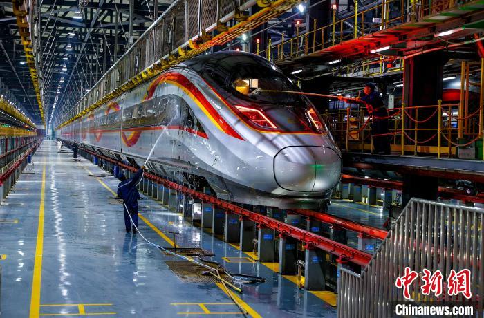 圖為修理庫(kù)中,工作人員清洗動(dòng)車(chē)?!垥?攝