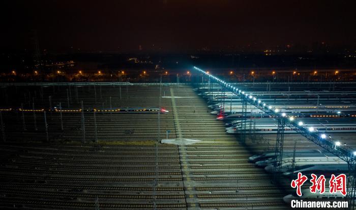 14日凌晨3時(shí),在武漢動(dòng)車(chē)段存車(chē)線上,百余組動(dòng)車(chē)整齊排列,勢(shì)如“陸地航母”,即將啟航迎接回家的人們。