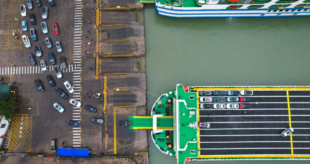 1月14日,在海南省海口市秀英港,新能源車排隊(duì)駛?cè)胄履茉窜噷S眠\(yùn)輸船“綠源二號”(無人機(jī)照片)。(新華社記者 楊冠宇 攝)