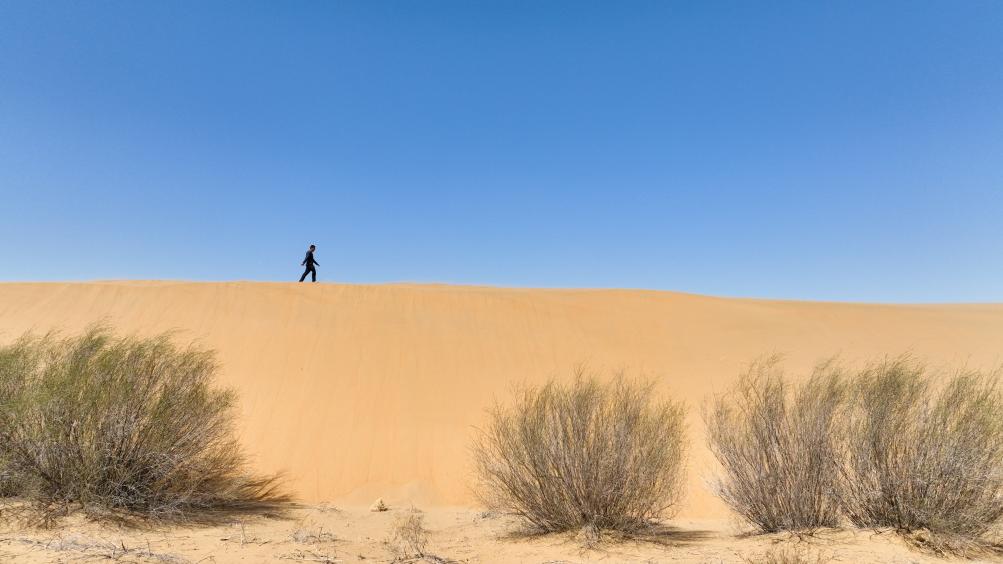 2024年4月11日,一名治沙人行走在達拉特旗境內的庫布其沙漠里(無人機照片)。新華社記者 貝赫 攝