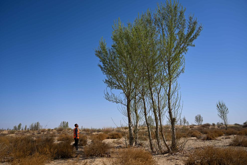 2024年4月11日,一名治沙人在達拉特旗境內的庫布其沙漠里巡護樹木。新華社記者 李志鵬 攝