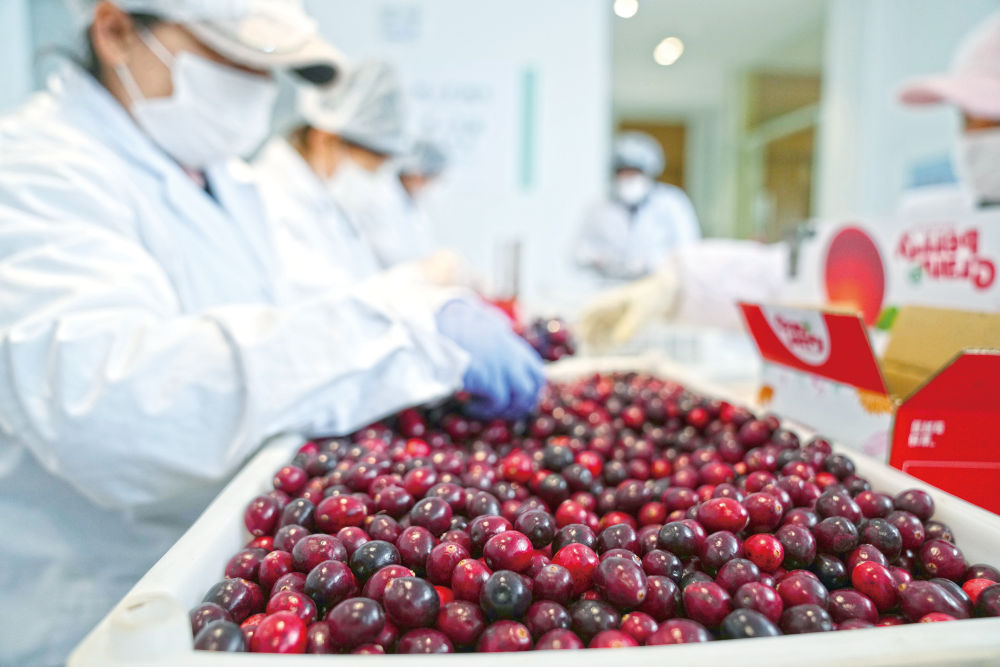 在黑龍江省撫遠市蔓越莓種植基地研發(fā)中心,工作人員正在挑選蔓越莓鮮果。新華社記者王建威