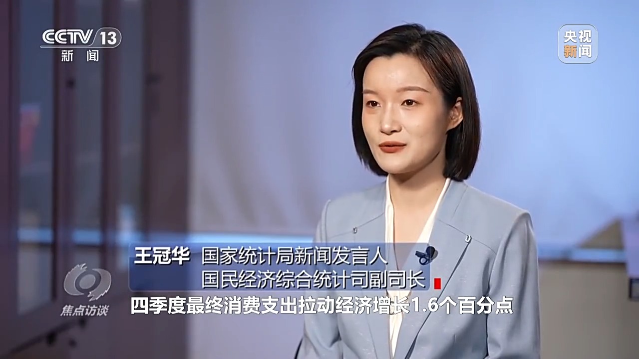 國家統(tǒng)計局新聞發(fā)言人、國民經(jīng)濟(jì)綜合統(tǒng)計司副司長 王冠華:四季度最終消費(fèi)支出拉動經(jīng)濟(jì)增長1.6個百分點,比上個季度提高了0.2個百分點。以冰雪經(jīng)濟(jì)、首發(fā)經(jīng)濟(jì)為代表的消費(fèi)新場景熱度上升,直播帶貨、即時零售等消費(fèi)新業(yè)態(tài)快速發(fā)展,還有一些國貨潮品,出海又出圈。這些變化增強(qiáng)了對消費(fèi)市場恢復(fù)的信心,同時這些新的趨勢也是未來進(jìn)一步擴(kuò)大國內(nèi)需求的重要政策著力點。