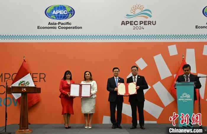2024年11月15日,亞太經(jīng)合組織第三十一次領(lǐng)導人非正式會議期間,中國香港與秘魯在秘魯利馬簽署自由貿(mào)易協(xié)定。圖為秘魯總統(tǒng)博魯阿爾特(左二)、秘魯外貿(mào)旅游部部長萊昂(左一)、香港特區(qū)行政長官李家超(右三)、香港特區(qū)政府商務(wù)及經(jīng)濟發(fā)展局局長丘應(yīng)樺(右二)完成簽署后合影。 香港特區(qū)政府新聞處供圖