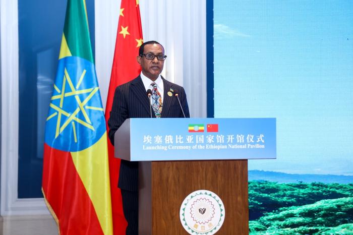 1月19日,埃塞俄比亞駐華大使塔費拉·德貝·伊馬姆在埃塞俄比亞國家館開館儀式上發(fā)表講話。(埃塞俄比亞駐華大使館供圖)