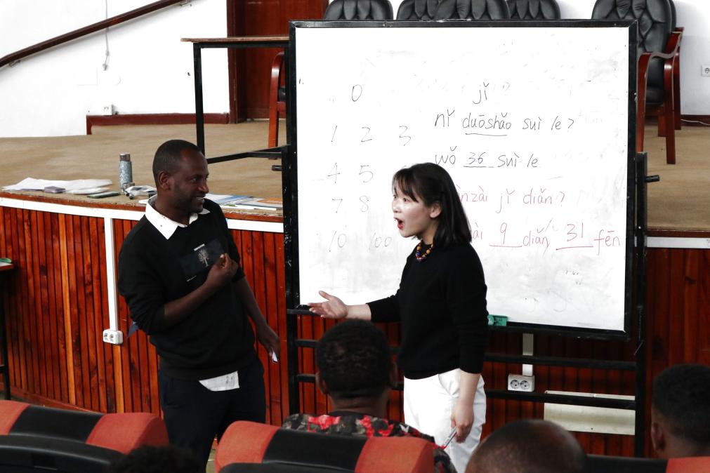 2024年12月2日,在埃塞俄比亞亞的斯亞貝巴大學,孔子學院老師宋瑞榮(右)在教室與學生互動。新華社記者 劉方強 攝