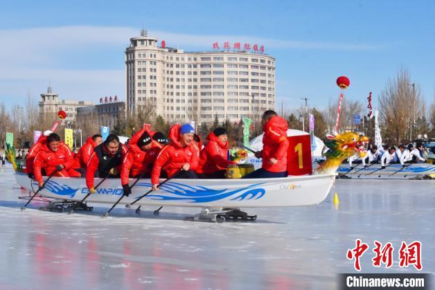 1月20日,內蒙古盛世柳蘭代表隊代表中國參加錫林郭勒國際冰上龍舟錦標賽。孫沐野攝