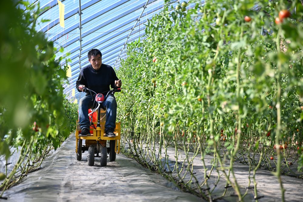 在延安市寶塔區(qū)劉興莊村,劉浪浪駕駛農(nóng)機在大棚內運送物資。新華社記者 張斌 攝
