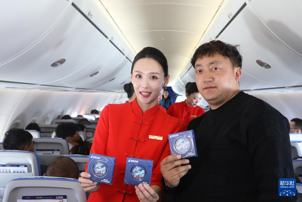 1月14日,斯郎倫珠在南航CZ8233航班上展示空姐為乘客贈(zèng)送的C919徽章。新華社記者 田建川 攝