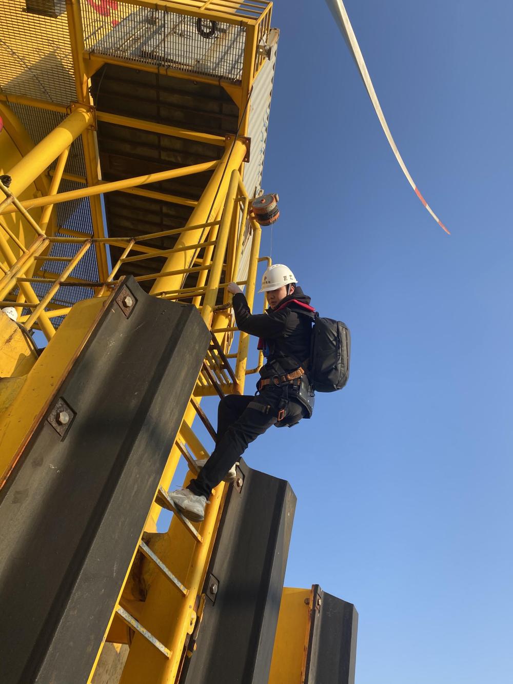 爬上數(shù)十米高的風機進行檢修
