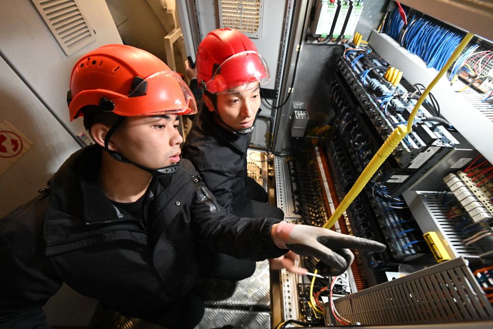 鄭桂雄(左)和張宗昌在機艙內討論風機故障處理方法。新華社記者 林善傳 攝
