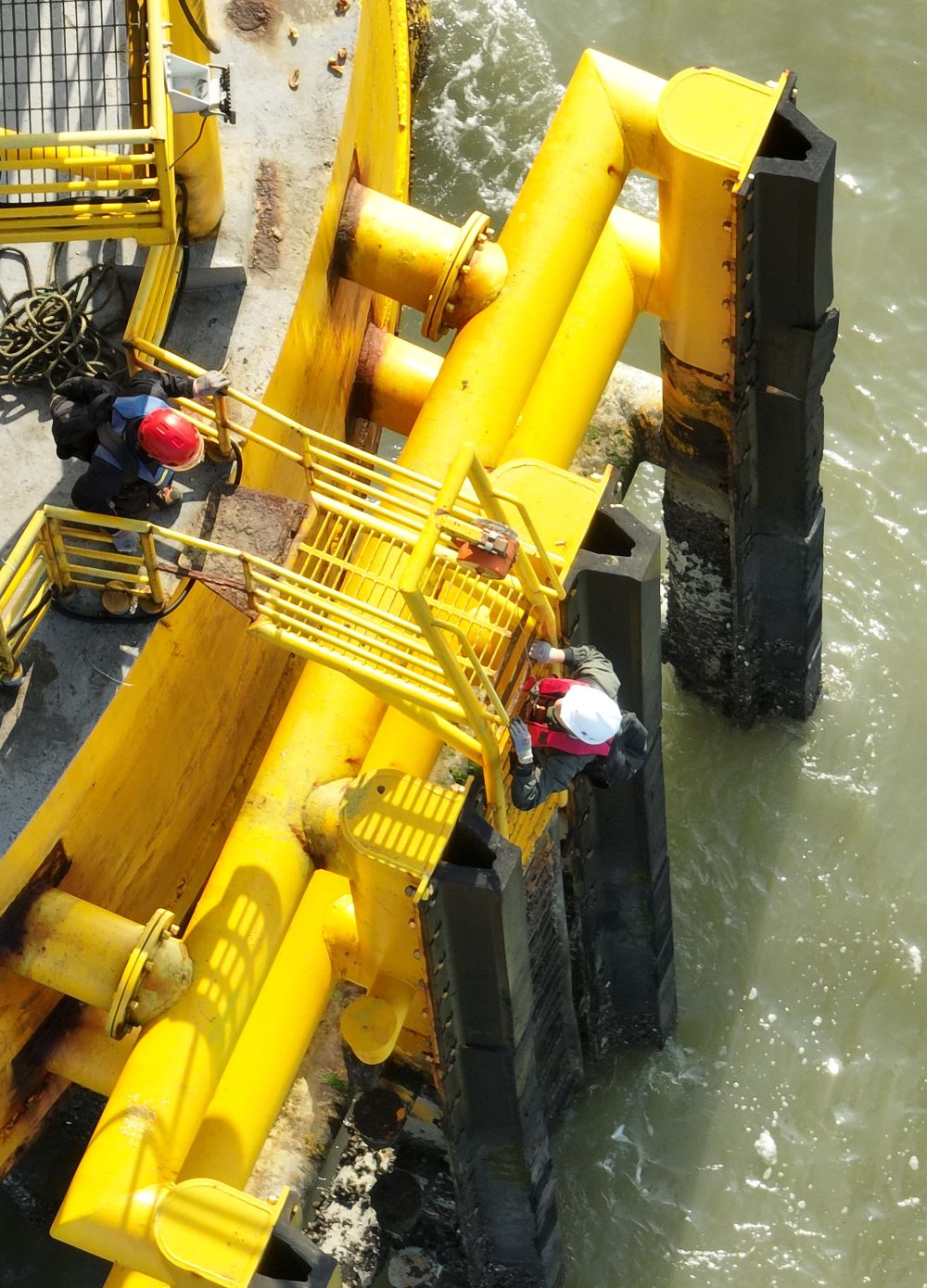 記者爬上海上風電平臺基座。新華社記者 林善傳 攝