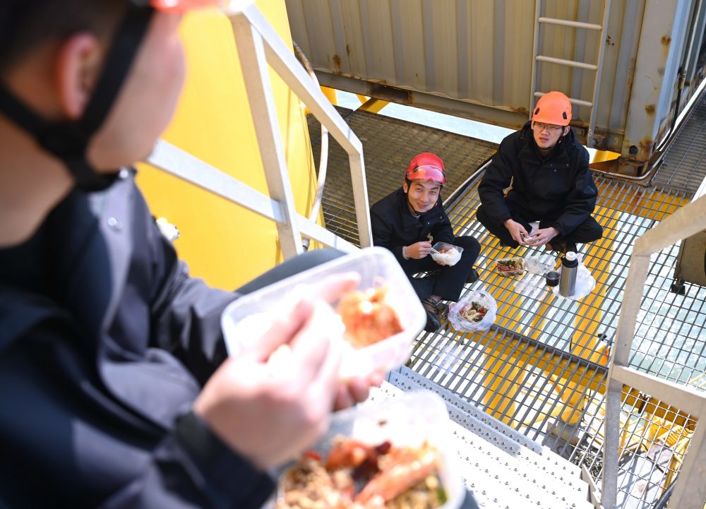 工程師們在海上風電塔基上吃著從岸上帶來的午餐。新華社記者 林善傳 攝