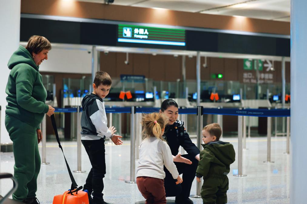 俄羅斯瑪莎一家,申請(qǐng)了臨時(shí)入境許可,在北京中轉(zhuǎn)??吹揭恍杏腥齻€(gè)孩子,孫麗靜主動(dòng)上前服務(wù),為孩子們倒上溫水解渴,陪他們玩耍。