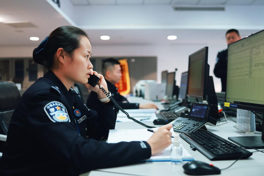 指揮中心,民警李思雨在接聽(tīng)電話。新華社記者 任沁沁 攝