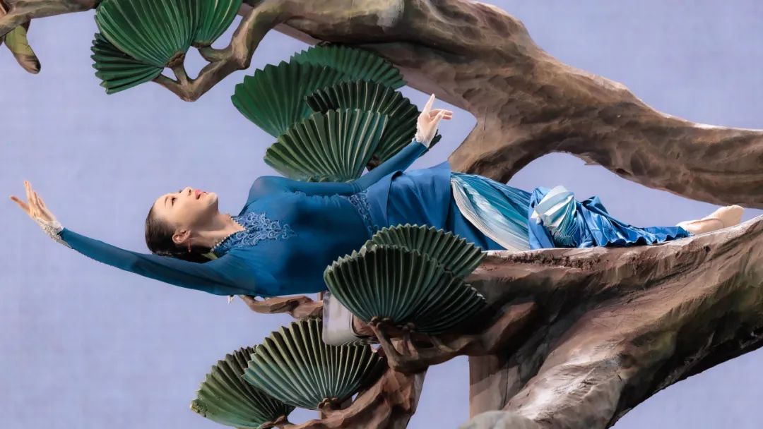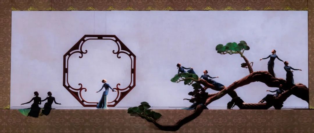 宋畫以筆觸細(xì)膩、意境深遠(yuǎn)著稱,尤其是花鳥(niǎo)畫,在宋朝迎來(lái)了獨(dú)樹(shù)一幟的黃金時(shí)代。編導(dǎo)參考大量宋畫作品,尤其從南宋畫家林椿的《十全報(bào)喜圖》中獲取靈感,將宋畫的美學(xué)哲學(xué)完美地轉(zhuǎn)譯為舞蹈中的構(gòu)圖邏輯。舞臺(tái)背景是紋理清晰的畫布,幕簾和升降地屏搭建出裱框,整個(gè)舞臺(tái)如同從水平面上翻轉(zhuǎn)而立,變成巨幅的國(guó)畫卷軸。