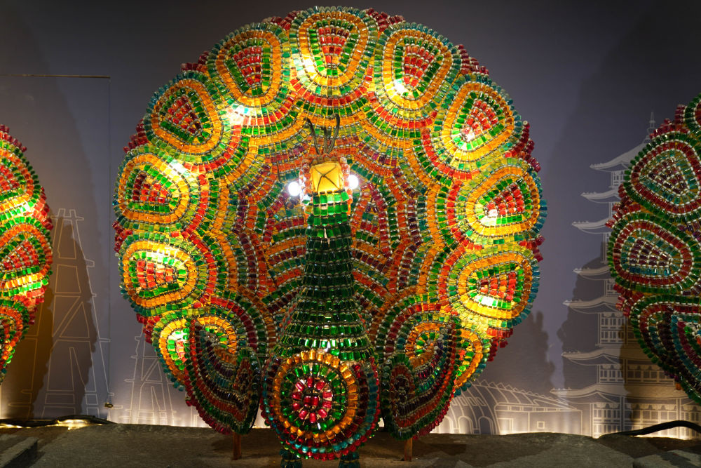 這是在中國(guó)彩燈博物館里拍攝的由玻璃藥瓶制作的彩燈“孔雀開(kāi)屏”(1月18日攝)。