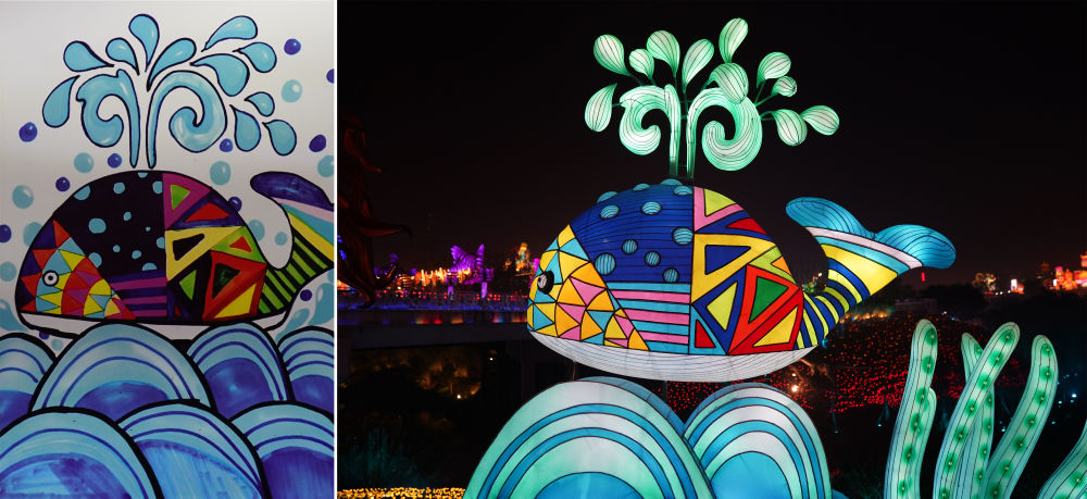 拼版照片:左圖為一名小朋友的繪畫(huà)作品《噴水的鯨魚(yú)》,右圖為彩燈工匠制作出的彩燈版《噴水的鯨魚(yú)》(1月14日攝)。