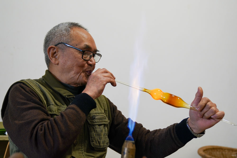 彭正華將燒軟的玻璃管吹塑成型(1月15日攝)。